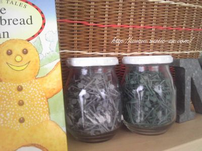 いろんな雑貨とともに、クギの瓶詰め。2種類。