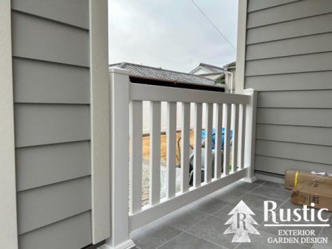 玄関前の手すりとお庭を囲む目隠しフェンスは