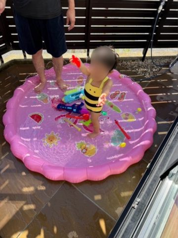 デッキから降りた天然石フロアでは赤ちゃんプールがピッタリ!