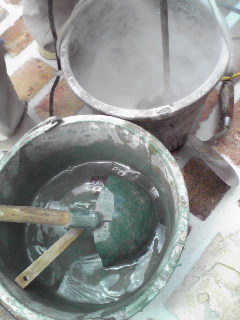 ハンドミキサーみたいな工具でまぜまぜして目地剤を作ってます。