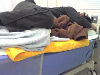まだうなりながら寝返りを打って痛みに耐えていました。