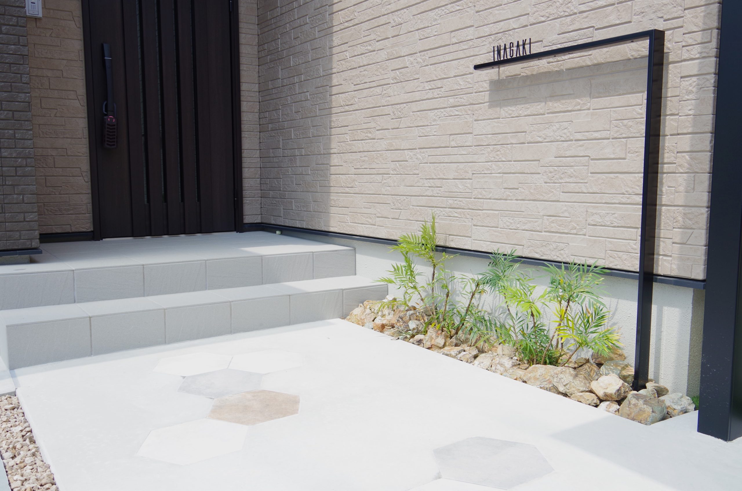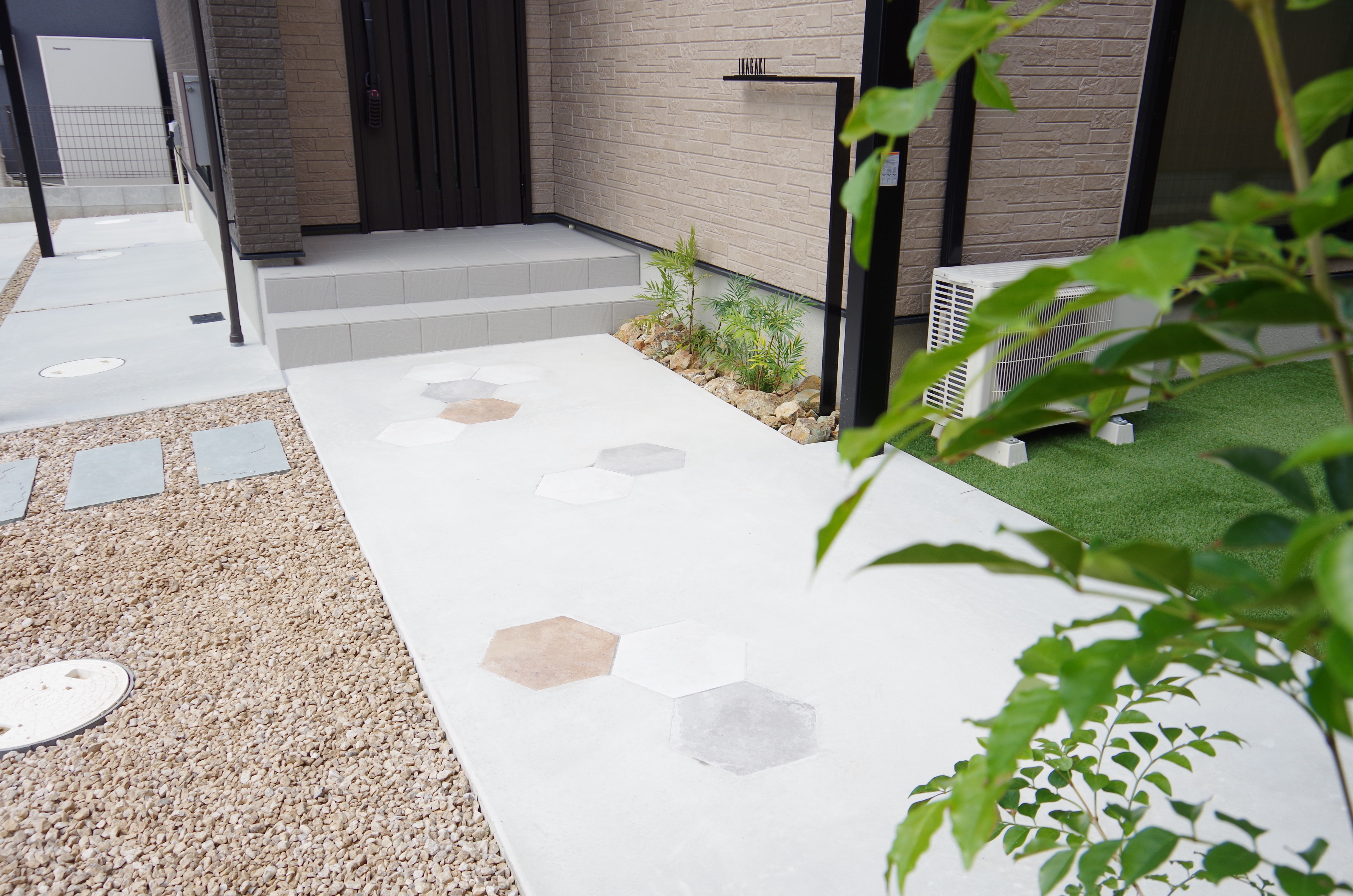 アプローチはベージュ系古レンガでヨーロッパ風に。